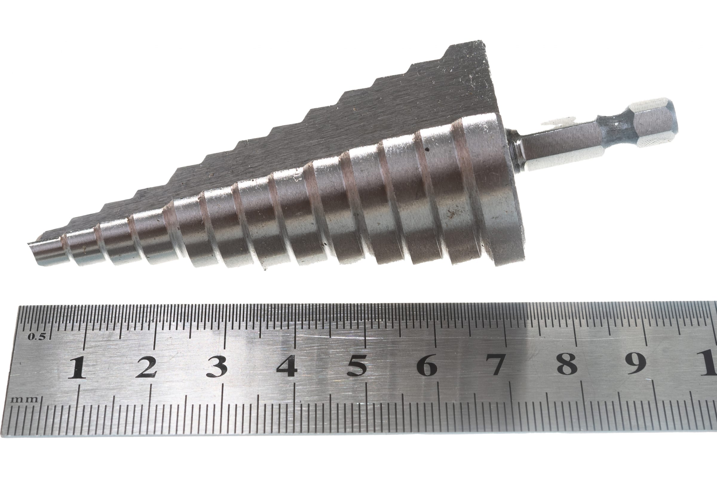 На каждой ступени есть маркировка фактического диаметра. Сверло изготовлено из быстрорежущей стали, имеют прямую спираль.