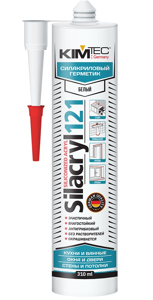 KIM TEC Silacryl 121 представляет собой акрил на основе полиакрилата, который под воздействием воды быстро превращается в уплотнитель, обладающий высокой эластичностью и прочностью. Широкий спектр применения для наружных и внутренних работ по уплотнению и герметизации деревянных конструкций кирпичной кладки, керамики, металлов и пластиков. Для природного камня и мрамора нужен тест.